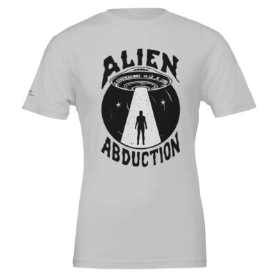 The design features a mysterious UFO beaming up a lone figure, capturing the eerie allure of alien encounters that have fascinated generations. The monochromatic artwork, set against a sleek grey background, brings the scene to life, making this t-shirt a must-have for anyone intrigued by the mysteries of the universe. Whether you’re a fan of sci-fi, a believer in the paranormal, or just love unique graphic tees, this shirt will add a touch of cosmic curiosity to your wardrobe.