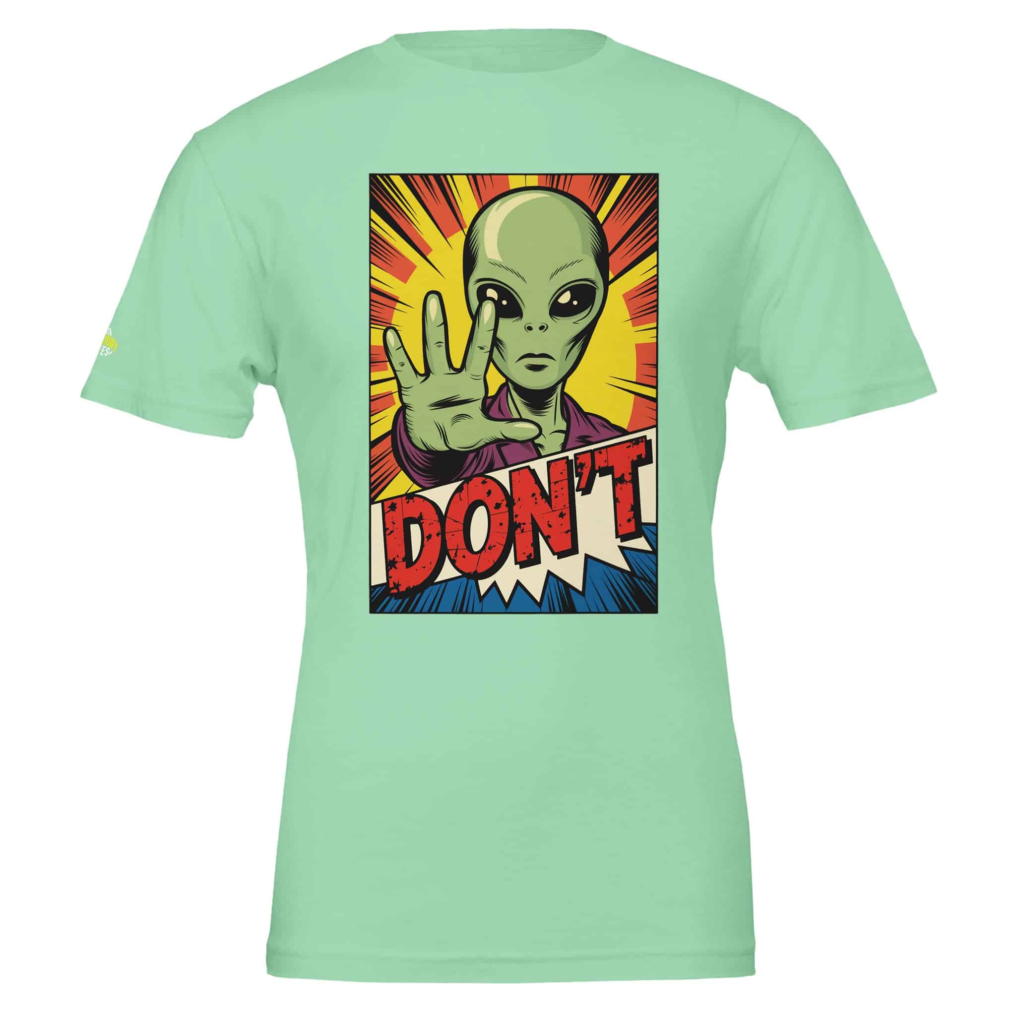 Step into another dimension with the “Alien Don’t” T-shirt from toontreasure! Featuring a retro, comic-book-style alien in classic pop art colors, this design screams personality and fun. The powerful message, “Don’t,” paired with the outstretched hand, creates a humorous yet mysterious vibe perfect for sci-fi fans, conspiracy theorists, or anyone who enjoys a bit of extraterrestrial fun.