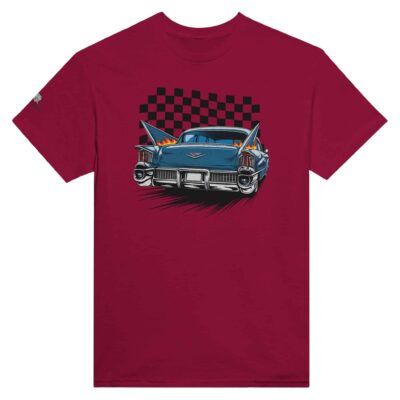 The design features the iconic tail fins of a 1950s Cadillac, complete with flaming accents that add a touch of retro cool to this vintage ride. The bold, detailed artwork captures the spirit of the open road, evoking memories of hot rods, drive-ins, and endless highways. The background of checkered flags adds a racing vibe, making this shirt a must-have for fans of classic cars and the culture that surrounds them.