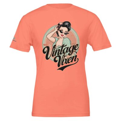 The “Vintage Vixen” design is a celebration of classic pin-up culture, featuring a confident, stylish woman who embodies the charm and glamour of the 50s. Her playful pose, complete with cat-eye sunglasses and a polka dot dress, is a nod to the rockabilly and retro fashion of the era. The circular background and elegant lettering complete the vintage aesthetic, making this shirt not just a piece of clothing, but a statement of timeless style.